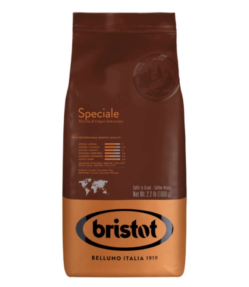 Kawa ziarnista Bristot Speciale to ciekawa mieszanka robusty i arabiki z plantacji w Ameryce Południowej i Środkowej, która dzięki uniwersalnemu charakterowi będzie smakowała większości amatorów kawy. Bristot Speciale wyróżnia się spośród innych kaw tym, że jest bardzo delikatna dla żołądka. Bristot Speciale posiada średnią zawartość kofeiny - fenomenalnie sprawdzi się na rozpoczęcie dnia, jak i do popołudniowej chwili przerwy od obowiązków. Bristot Speciale dzięki świetnemu dobraniu ziaren i idealnemu wypaleniu sprawia, że odpowiednio zaparzona kawa jest intensywna, lecz aksamitna w smaku. Kawa Bristot Speciale najlepiej smakuje zaparzona w ekspresach i kawiarkach. Bez najmniejszych problemów można ją przyrządzić także w sposób tradycyjny, należy jednak pamiętać o odpowiedniej grubości zmielenia kawy.
