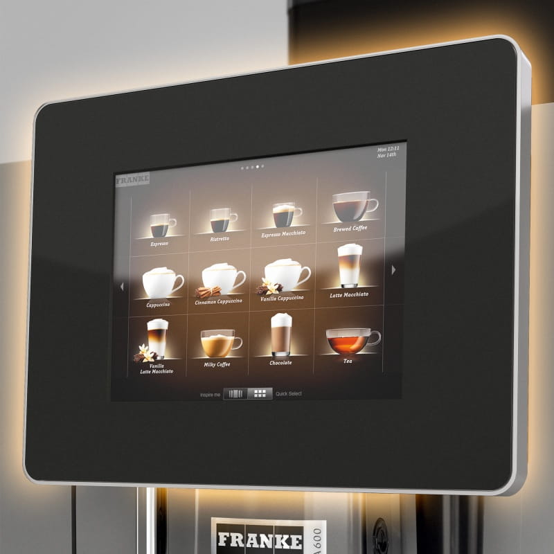 Ekspres posiada krystalicznie czysty, 8-calowy ekran dotykowy, dzięki któremu przegląd menu oraz funkcji jest prosty i intuicyjny. Wyświetlacz skonfigurować można według indywidualnych potrzeb i wymagań. Aby przyrządzić kawowy specjał wystarczy jeden ruch palca. To szybka i wygodna opcja, szczególne w przypadku dużych zamówień. Poza wielkoformatowym menu na wyświetlaczu dodatkowo umieszczać można reklamy i komunikaty, które wspomogą działania sprzedażowo- marketingowe Twojego biznesu. Funkcjonalne oświetlenie LED zapewnia całkowitą kontrolę nad urządzeniem, wysławiając komunikaty ostrzegawcze i serwisowe (jak np. „Dadaj ziarna kawy”, „Uwaga: gorący napój w przygotowaniu”). Technologia modelu A600 jest bezkonkurencyjna zarówno w przypadku samoobsługi, jak również zorganizowanej pracy personelu.