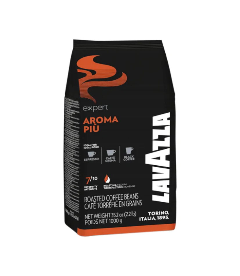 mieszanka ziaren o proporcjach arabiki (60%) i robusty (40%), dzięki sporej domieszce robusty zagwarantuje espresso z trwałą i gęstą cremą, a także doskonale sprawdzi się jako baza do kaw mlecznych. Intensywny aromat z wyczuwalnym słodkim zapachem miodu i migdałów oraz smak w którym można wyczuć miód i suszone owoce to ogromne atuty tej kawy, która podbiła już serca wielu smakoszy. Lavazza Expert Plus Aroma Piu szczególnie dobrze sprawdza się w ekspresach automatycznych.