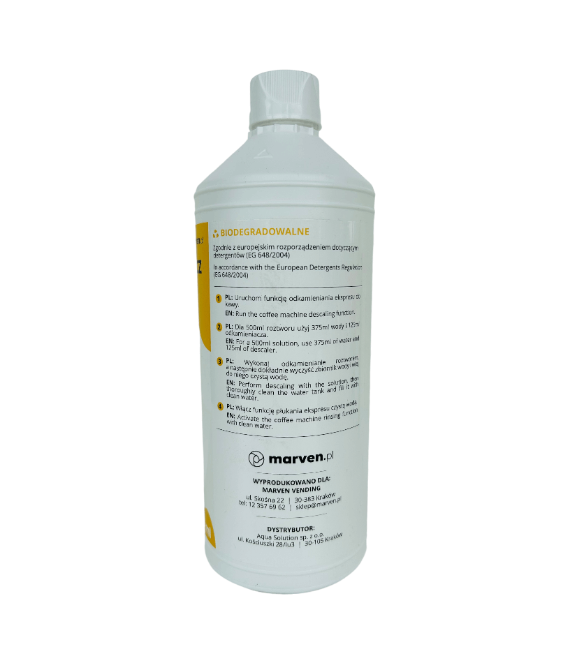 Produkt dostępny w praktycznej butelce o pojemności 1 litra, wyposażonej w precyzyjną podziałkę co 50 ml i blokadę otwarcia dla bezpiecznego przechowywania. Przezroczysta wstawka na boku butelki ułatwia kontrolę poziomu płynu, pozwalając na wygodne planowanie kolejnych zakupów. Odkamieniacz uniwersalny wystarcza na co najmniej 8 pełnych cykli czyszczenia, co czyni go produktem ekonomicznym i praktycznym.