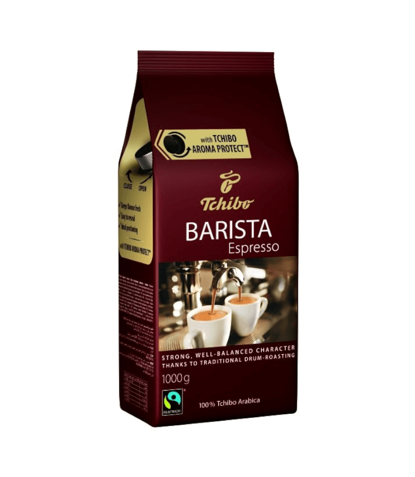 to najlepszej jakości Espresso. Jej ziarna wypala się przy użyciu tradycyjnych bębnowych maszyn prażalniczych – zupełnie jak przed 100 laty. Specjalne powolne prażenie daje ziarnom kawy więcej czasu, aby wydobyły swój niepowtarzalny charakter. W rezultacie powstaje więc najlepszej jakości kawa. Znak Fairtrade oznacza, że Tchibo wspiera sprawiedliwy handel. Nasz wkład polega na długofalowej poprawie warunków życia i pracy rolników w krajach, gdzie uprawiana jest kawa. Kawa Barista Espresso w ziarnach jest szczególnie polecana posiadaczom ekspresów do kawy z wbudowanym młynkiem, tych półautomatycznych lub zwykłych kawiarek. Ciesz się smakiem kawy Barista Espresso – espresso z pianką, a po dodaniu spienionego mleka – cappuccino lub Latte Macchiato.